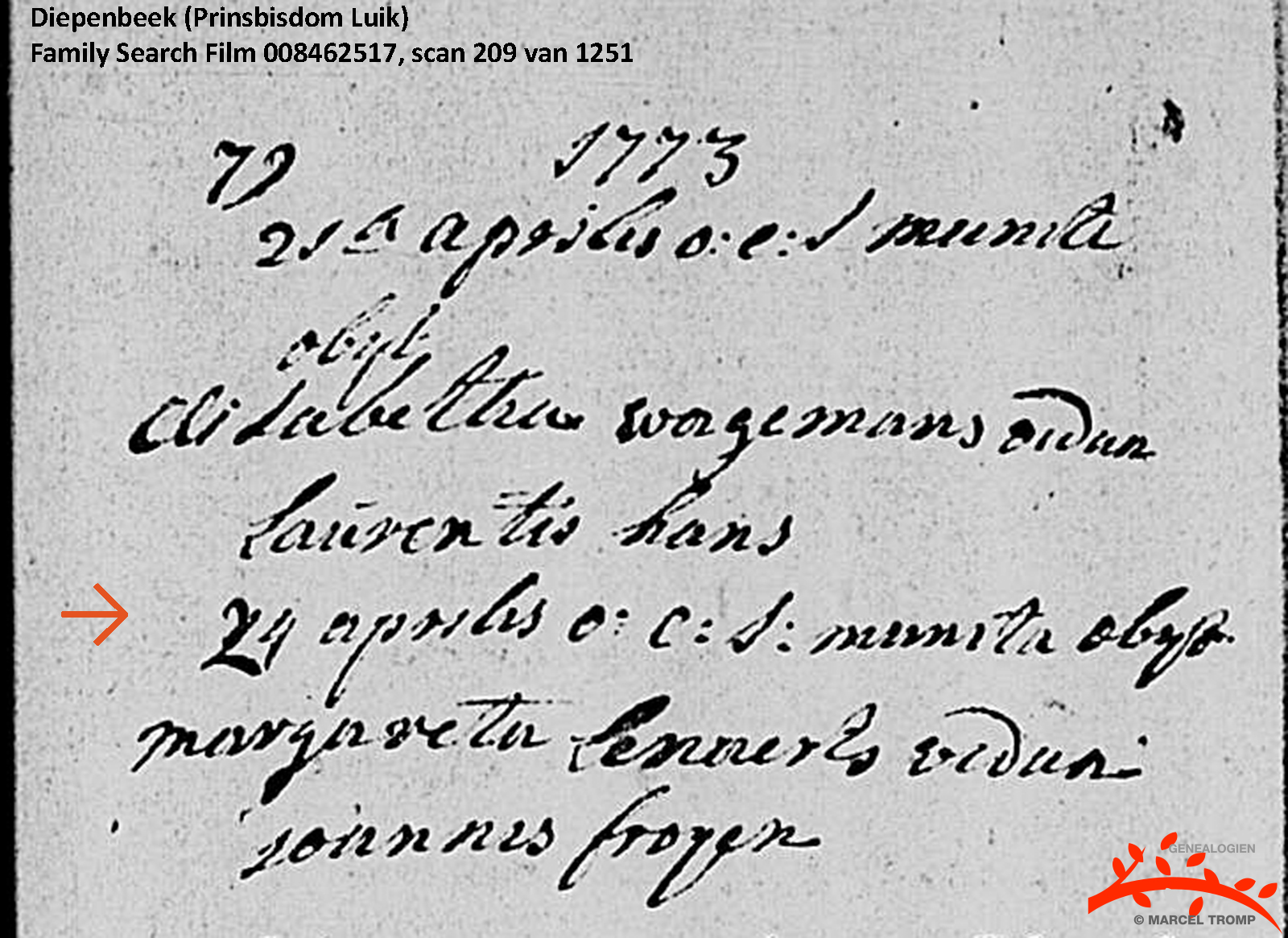 | 24-04-1773 overlijdensakte van Margaretha, weduwe van Joannes Froyen, Diepenbeek (Prinsbisdom Luik) RK |