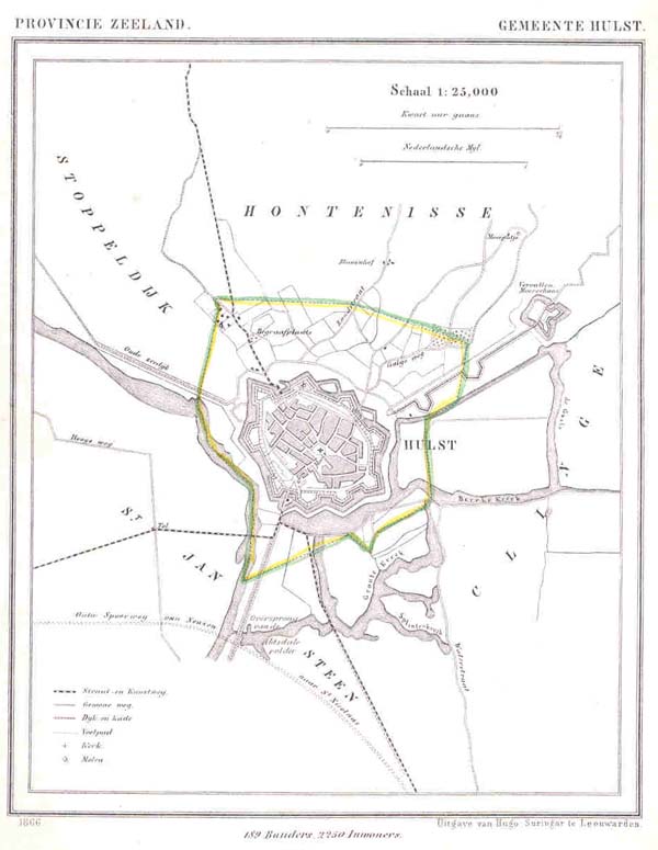 Hulst, 1866. ►ga hier naar een interaktieve kaart van Hulst: met behulp van een schuifje kan de huidige kaart uit 2014 min of meer transparant op de kaart uit 1866 worden gelegd. |