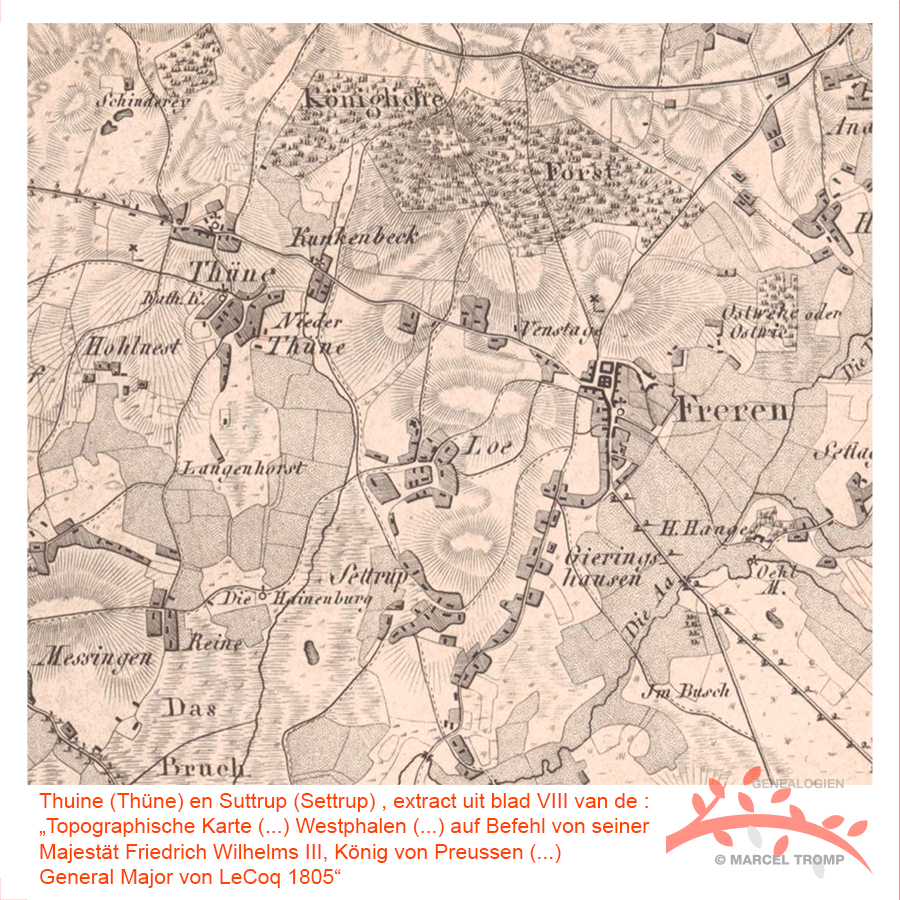 In Suttrup, een kerkdorp van Tunen, ligt één van de oorsprongen van Catharina Timmer die met Johannes Tromp in Beverwijk gehuwd is. Een voorvader van haar, Dirk Sweer, was geboren en gestorven in de 17e eeuw, toen het Graafschap Lingen eigendom was van de Prinsen van Oranje. Hij was een zgn. erfboer en had grondbezit, en zijn dochter Maria van hem was een erfgenaam van dit bezit. Maria is een voormoeder van één van de oprichters van het warenhuis Vroom & Dreesman. Zijn zoon Brand , onze voorvaders uit het tweede huwelijk van Dirk, is getrouwd met ene Maria Evers, erfboerin uit het kerkdorp Hollenhorst van Tunen. Diens zoon Geert (niet de oudste zoon, dus geen erfboer) trouwde met de erfboerin Catharina, dochter van een erfboer Timmer uit Suttrup. Diens zoon Johannes is uiteindelijk geëmigreerd naar Beverwijk en was de overgrootvader van ![]() |