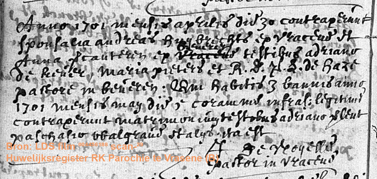 Op 30 april 1701 zijn in ondertrouw gegaan: Andreas Huijbrechts van Beveren (B) en Anna Vercauteren van Vrasene (B) met getuigen Adriaan de Kever en Maria Pieters. Getuigen bij hun huwelijk waren Adriaan Verlent en Paschasio Walgraven