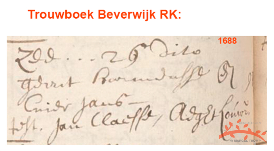 - gehuwd op 26.04.1688 te Beverwijk RK met