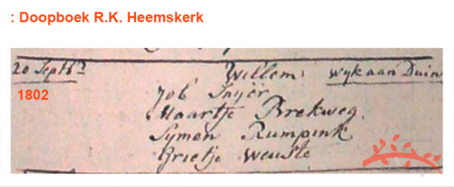 inschrijving in het doopregister Heemskerk RK 20 septr [1802] Willem [geboren te ] Wijk aan Duin Job Snijer Maartje Brekweg Sijmen Rumpink Grietje Weuste |