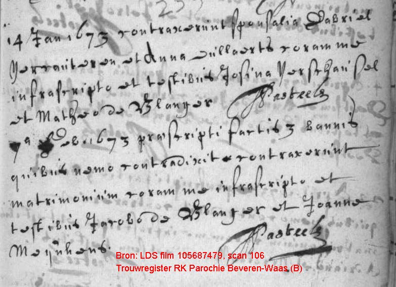 | Ondertrouw op 14-01-1673 en (kerkelijk) huwelijk op 07-02-1673 van Gabriël en Anna Dullaerts te Beveren-Waas (B) |