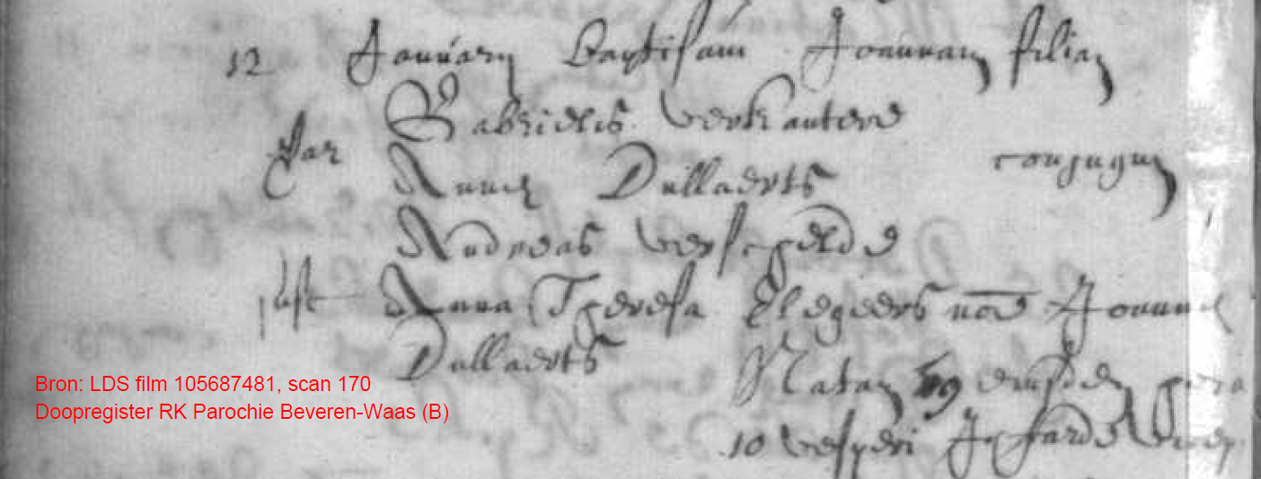 | 12-01-1681 doopakte van Johanna Vercauteren, vader Gabriël Vercauteren en moeder Anne Dullaerts. Getuigen: Andreas Verschelde en Anna Theresa Dullaerts |