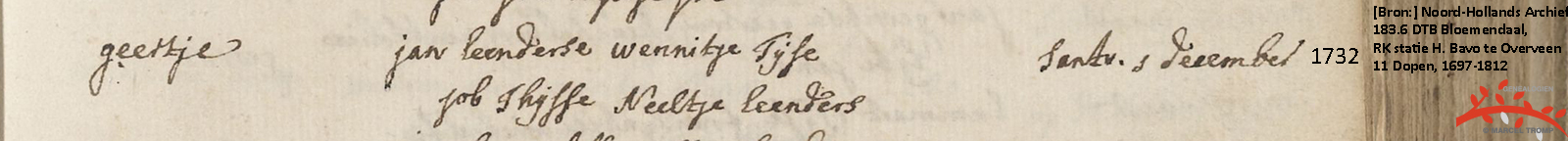 20.02.1729 huwelijksinschrijving van Leendert en Wennetje in het register van de RK Statie H. Bavo te Overveen (Bloemendaal). Het bruidspaar woonde in Zandvoort. De bruidegom staat hier genoteerd als 'Jan Gerritse' maar in alle overige akten heet hij 'Jan Leenderse'. |