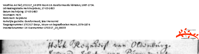 1683, inschrijving van Herk Reijnders in het lidmatenregister van de Gereformeerde Kerk te Hoorn |