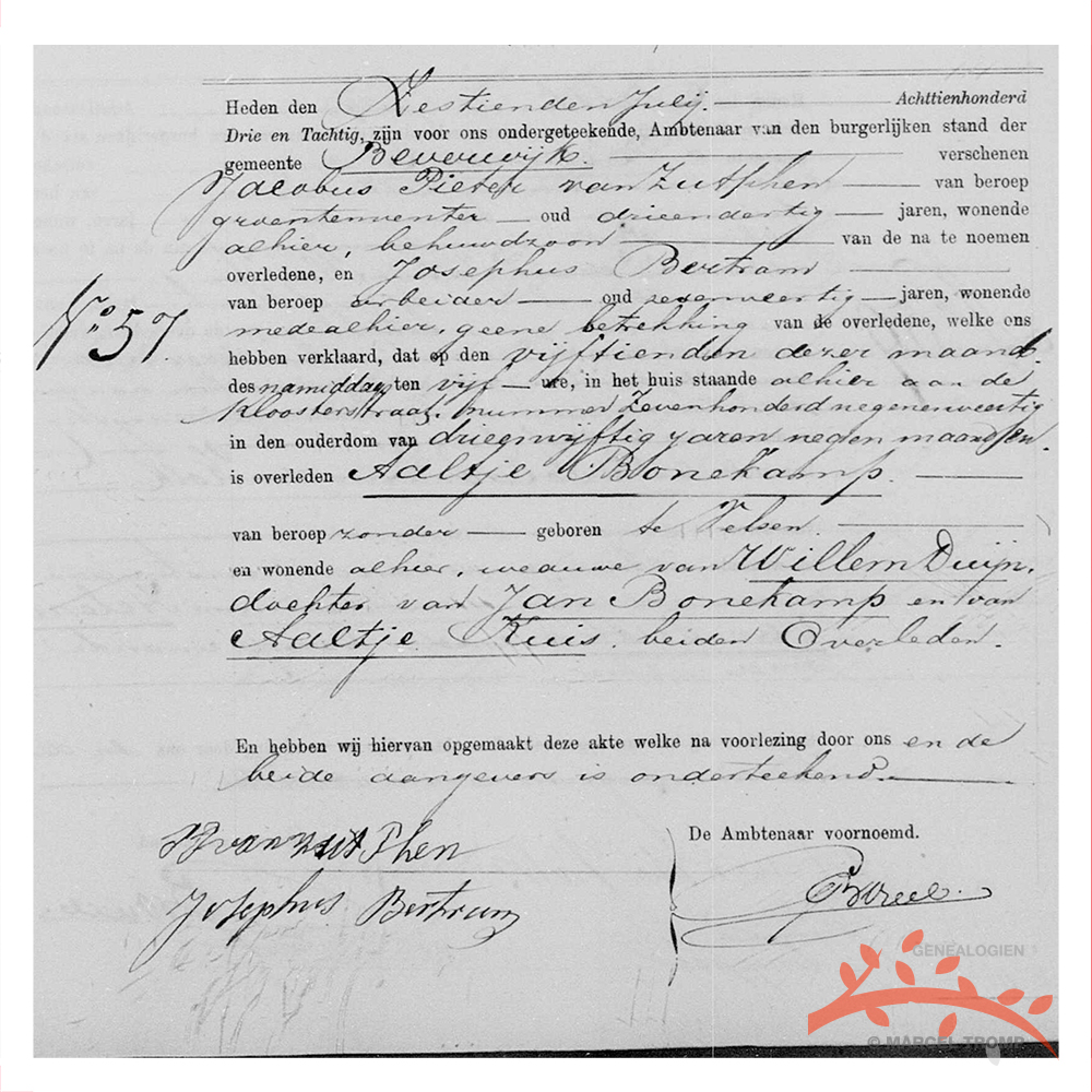 1883, Beverwijk, overlijdensakte van Aaltje |