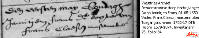 doopinschrijving Hoorn Gereformeerd: 'den eersten may sondagh Jannitjen Fransdr dochter van Frans Claesz Mastenmaker |