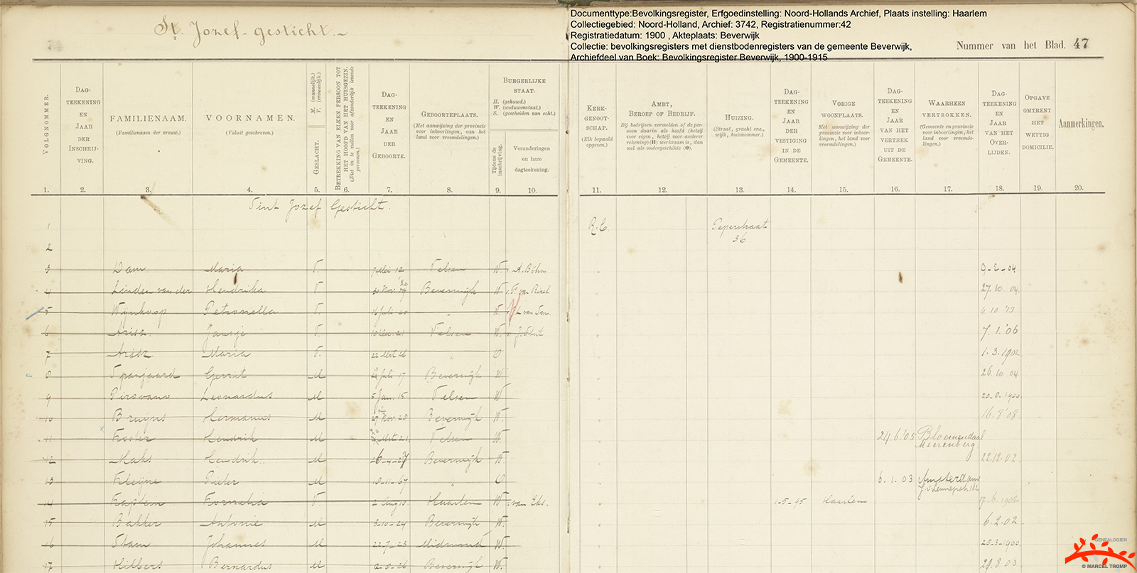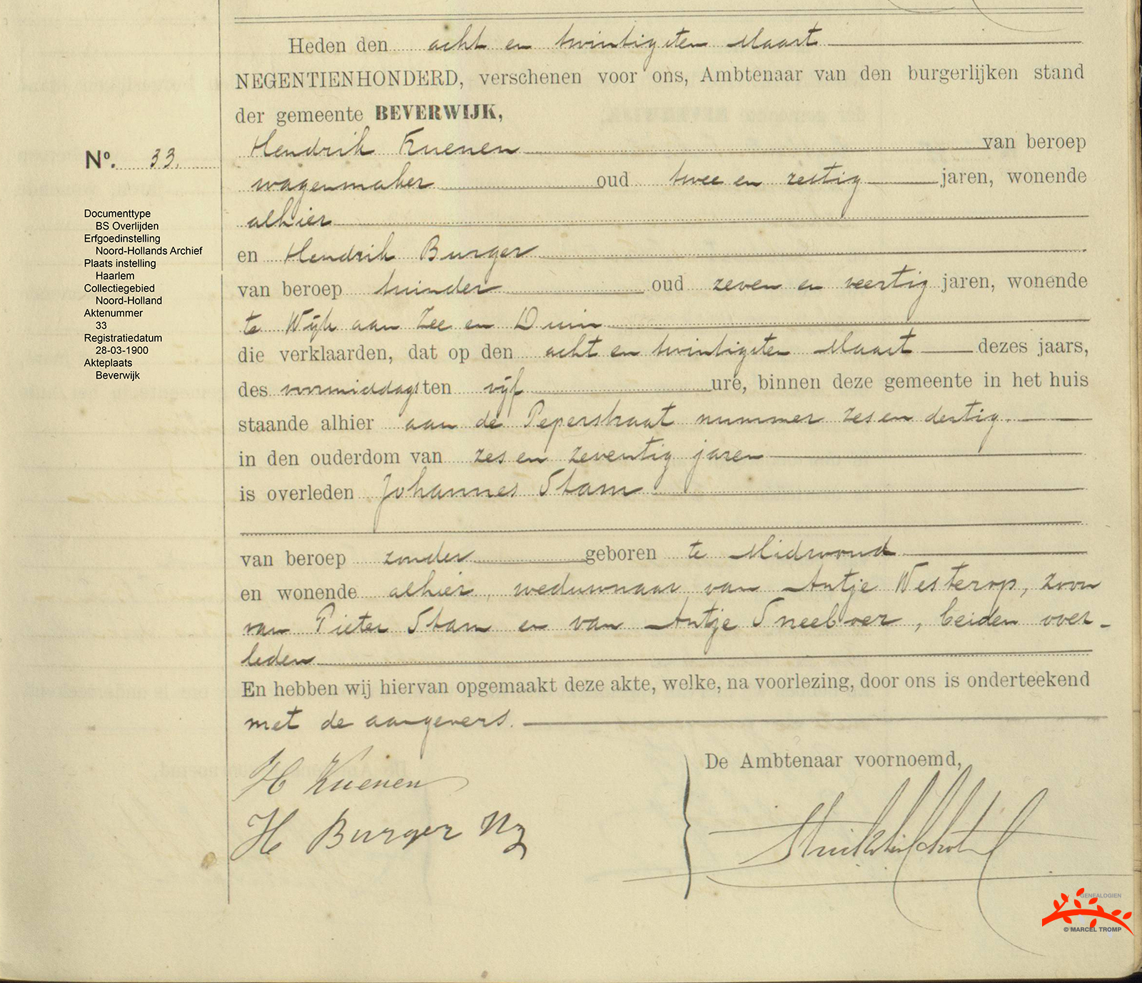 rond 1880 is Jan met zijn gezin in Beverwijk gaan wonen in de Wijkermeerpolder. Na de dood van zijn vrouw Antje in 1897 is hij opgenomen in het St. Jzef gesticht (bejaardentehuis) aan de Peperstraat 36 alwaar hij is overleden op 28.03.1900 |