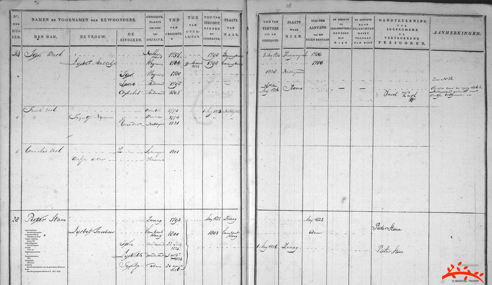Midwoud, bevolkingsregister 1821-1834. Klik hier voor alle pagina's van het bevolkingsregister te Midwoud tussen 1820 en 1860 waarin het gezin van Pieter Stam voorkomt. |