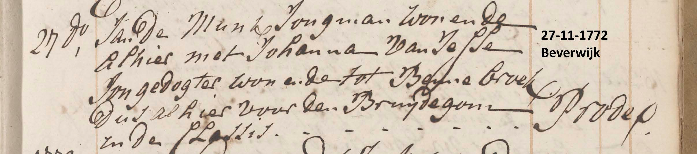| Beverwijk, 27-11-1772, ondertrouwinschrijving te Beverwijk, de bruid uit Bennebroek en de bruidegom niet aangeslagen voor de impost wegens onvermogen (armoede) [Bron: Noordhollands Archief, Inventaris 3772-41] |