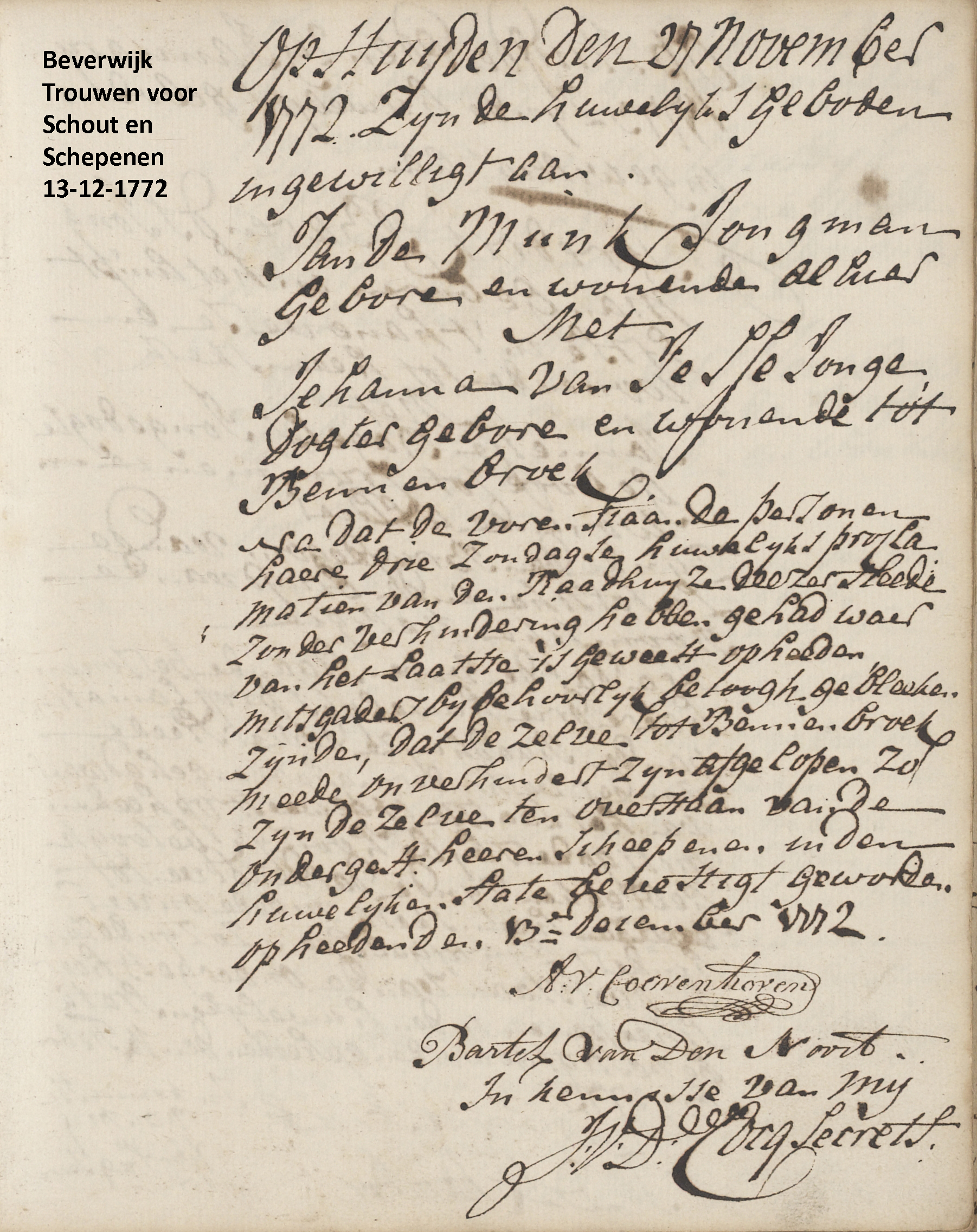 | Beverwijk, 13-12-1772, huwelijksinschrijving te Beverwijk, de bruid uit Bennebroek. [Bron: Noordhollands Archief, Inventaris 3772-34] |