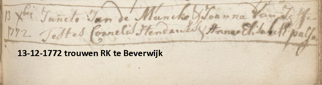 Beverwijk, 13-12-1772, huwelijksinschrijving RK te Beverwijk, getuigen: Cornelis Hendricks en Anna Elizabeth Palster