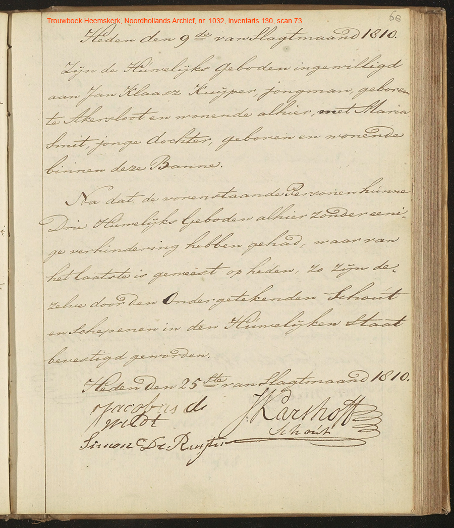 25-10-1810: inschrijving in het Trouwboek van Heemskerk.