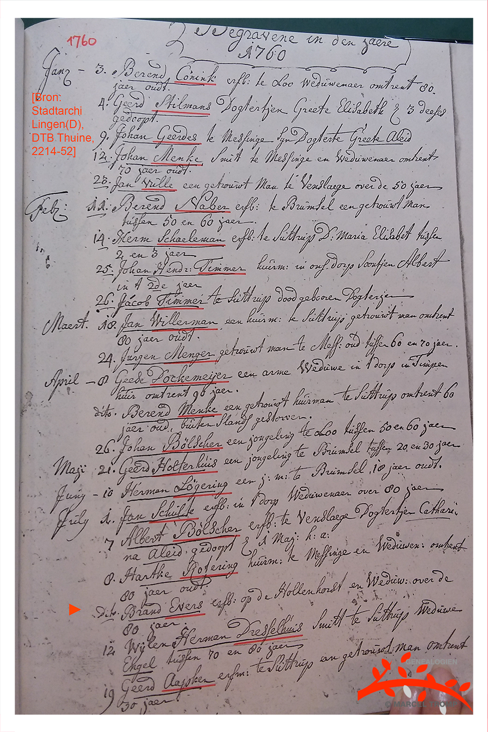 Brand's inschrijving in het begrafenisregister van Thuine: 08.07.1760. "Over de 80 jaar" ...? Brand is 72 geworden. [Bron: Stadtarchiv Lingen, DTB Thuine, inv.nr. 2214-52] |