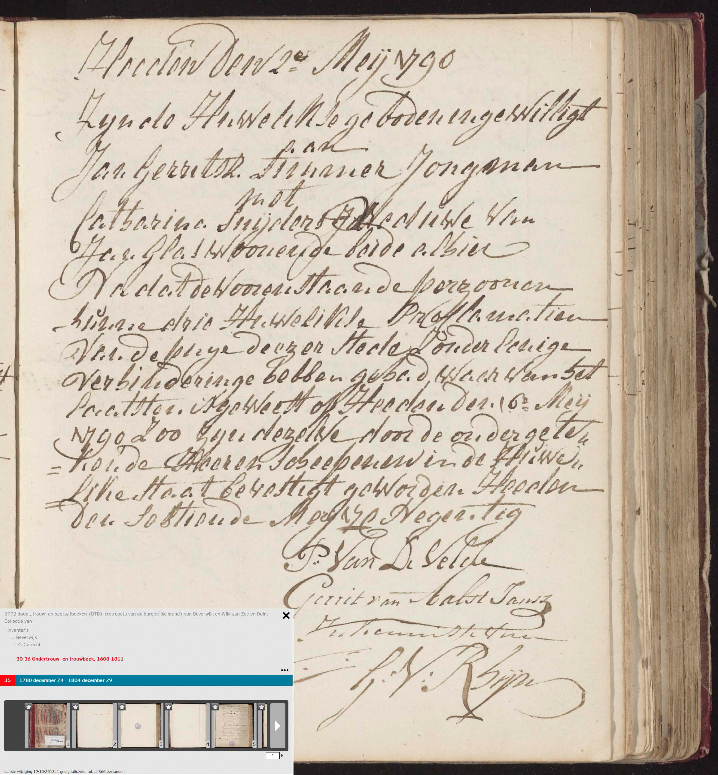 | huwelijksinschrijving 16-05-1790 te Beverwijk [Bron: Noordhollandsarchief] |