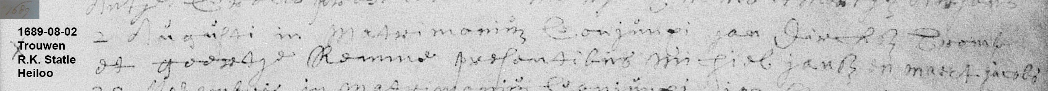 | 2 augustus 1689: door het huwelijk verenigd Jan Dirksz Tromp en Geertje Remme, getuigen Migiel Jansz en Maret Jacobs |