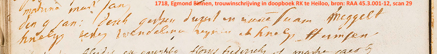 | Trouwen in de RK kerk te Heiloo op 9 januari 1718: den 9 jan: [1718] Derck Gertsen [met] Meggelt Knelijs [getuige] Wendelina Heijnen en Knelijs Stumsen [Humsen?] [Bron: Regionaalarchief Alkmaar, inventaris 45.3.001-12, scan 29, trouwinschrijving midden tussen de doopinschrijvingen genoteerd] |