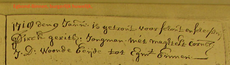 | Trouwen voor schout en schepenen (burgerlijk huwelijk) op 9 januari 1718 te Egmond-Binnen [Bron: vpnd.nl] |