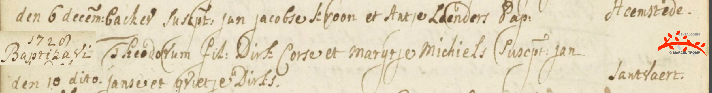 06-12-1728 doopakte RK H. Bavo te Berkenrode van zoon Dirk (de dopeling heeft hier de latijnse naam Theodorum) [bron: Noord-hollands archief, toegang 183.11, inventaris 26] |