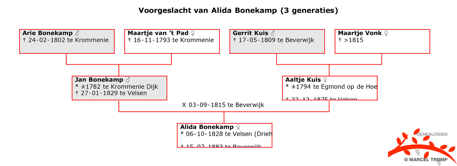 Hier wordt de kwartierstaat van Hendrik Duijn's moeder Alida Bonekamp getoond.De geografische oorprong is rond Beverwijk, Krommenie en Egmond.