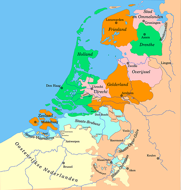 The Republic of the United Netherlands between 1588 and 1795 was a a confederation with a defense alliance and a customs union. They largely covered the territory of the present Netherlands. It acquired in the 17th century major political and economic power and was a major player on the world stage. The end came with the invasion of France in 1793-1795, though the decline was previously deployed. The Republic consisted of eight sovereign states: Groningen, Friesland, Overijssel, Gelderland, Utrecht, Holland, Zeeland and Drenthe. Each state controlled its own territory. Representatives from seven states (Drenthe fell out here) sent their representatives to the States-General in The Hague. Territories that were outside the eight provinces but belonged to the territory of the confederation, called Generality Lands, found themselves largely in what is now Zeeland Flanders, the current Dutch provinces of North Brabant, Limburg and in the southeast of the province of Groningen .