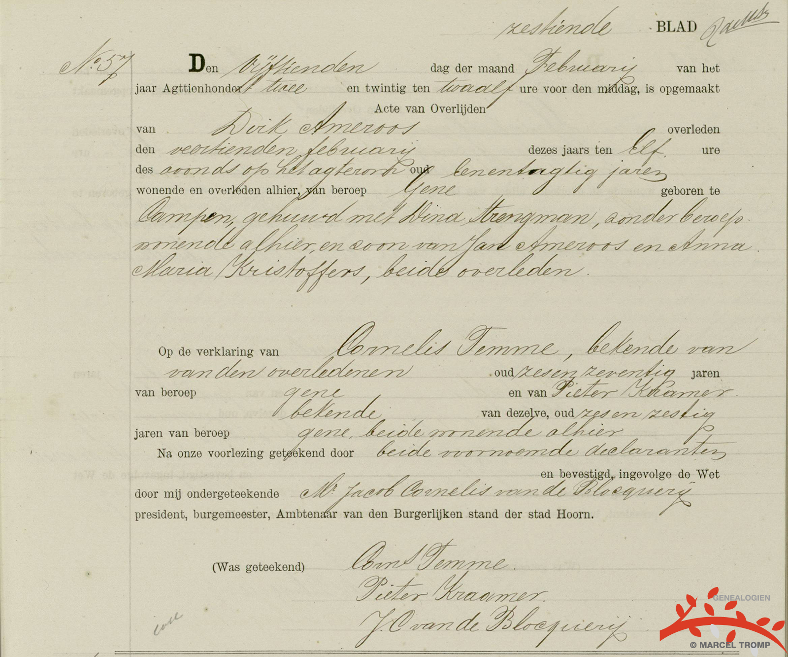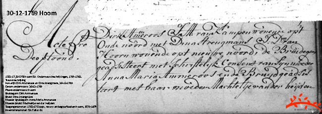 | Ondertrouw te Hoorn op 30.12.1769 van Dirk Ameroos en Dina Strengman |