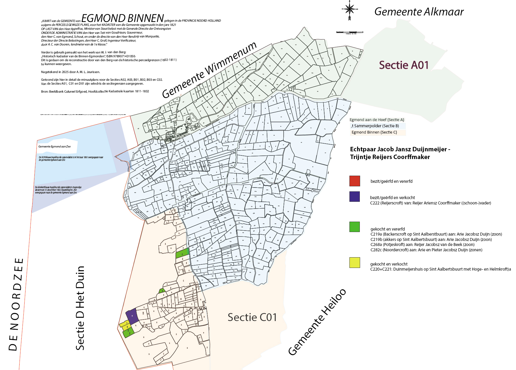 | Bezit van Jacob Jansz Duijnmeijer in de Binnen-Egmonden. Klik op de plaat boven voor een te vergroten PDF-bestand. [Bron: W.J. van den Berg, 1985: "Historisch kadaster van de Binnen-Egmonden, 1602-1811"] |
