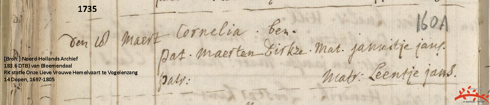 | 18.03.1735 doopinschrijving van Cornelia uit Bennebroek, vader Maerten Dirksze [van Wunnik], moeder Jannetje jans [van der Heijden], meter Leentje Jans |