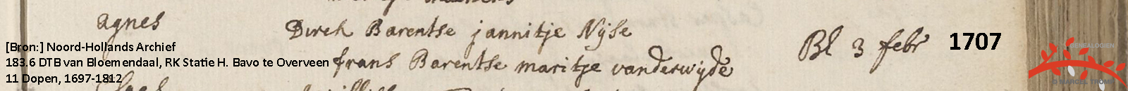 | 03.02.1707 doopinschrijving van Agnes te Overveen RK Statie H. Bavo. Het gezin woonde in Bloemendaal. getuigen: Frans Barentsez en Maritje van der Wijde |