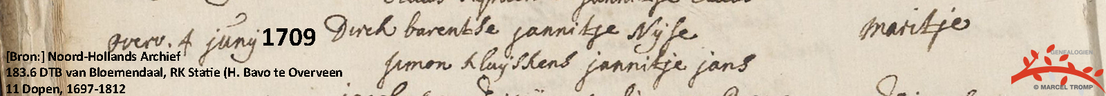 | 04.06.1709 doopinschrijving van Marijtje te Overveen RK Statie H. Bavo. Het gezin woonde in Overveen. getuigen: Simon Kluijskens en Jannitje Jans |